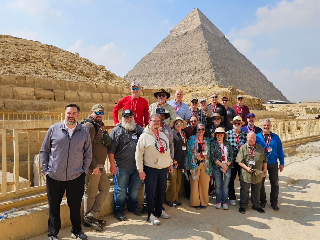 The second group was grounded at EWR airport in Newark, NJ for two blizzardly days and finally departed on February 25. Upon their arrival we had reorganized the itinerary to give them a slightly condensed version of the usual Galilee tour. They arrived in Jerusalem on Friday evening, February 27 and anticipated picking up on the usual itinerary for the balance of the pilgrimage. On Saturday morning they visited Mt. Zion. While there, the missiles from Iran begin to enter the air space. They were quickly returned to our hotel in Jerusalem and we spent some times (briefly) in the designated safe spaces there. Our tour company (Gate 1 Travel) immediately began making alternative arrangements for moving our group toward a safe and efficient trip home safely. Within a short time we were headed to the most southern part of Israel (Eilat) for a short overnight until early morning when we crossed over the border to Egypt. After a long bus ride we arrived in Cairo with flight arrangements already made for us to fly directly from Cairo to JFK very early Tuesday morning. Since we had Monday in Cairo our tour company made arrangements for us to take the group to the Giza Plateau to see the Pyramids and the Sphinx. A few of us also got the chance to spend a couple hours at the new Great Egyptian Museum. Amazing.